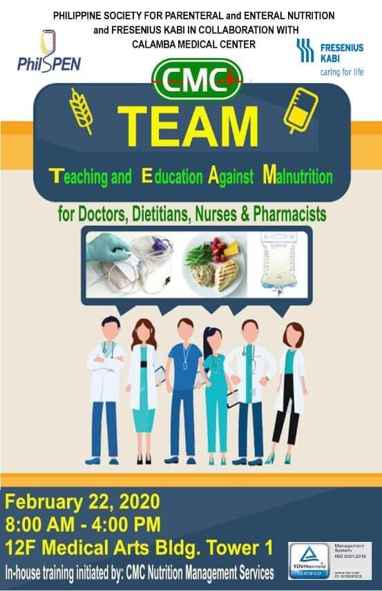 The very first Basic Nutrition Support for Teams Module was held in South Luzon, attended by participants (Doctors, Dietitians, Pharmacists, Nurses and even Administrators) from the different hospitals- Metro Lipa Medical Center, Daniel Mercado Medical Center, Lipa Medix Hospital, Metro Lemery Hospital, Our Lady of Caysasay Medical Center, Mary Mediatrix Medical Center, St. Frances Cabrini Medical Center, Calamba Doctors, Unihealth Southwoods, Perpetual Binan, St. Camillus, St Patrick and Batangas Medical Center.